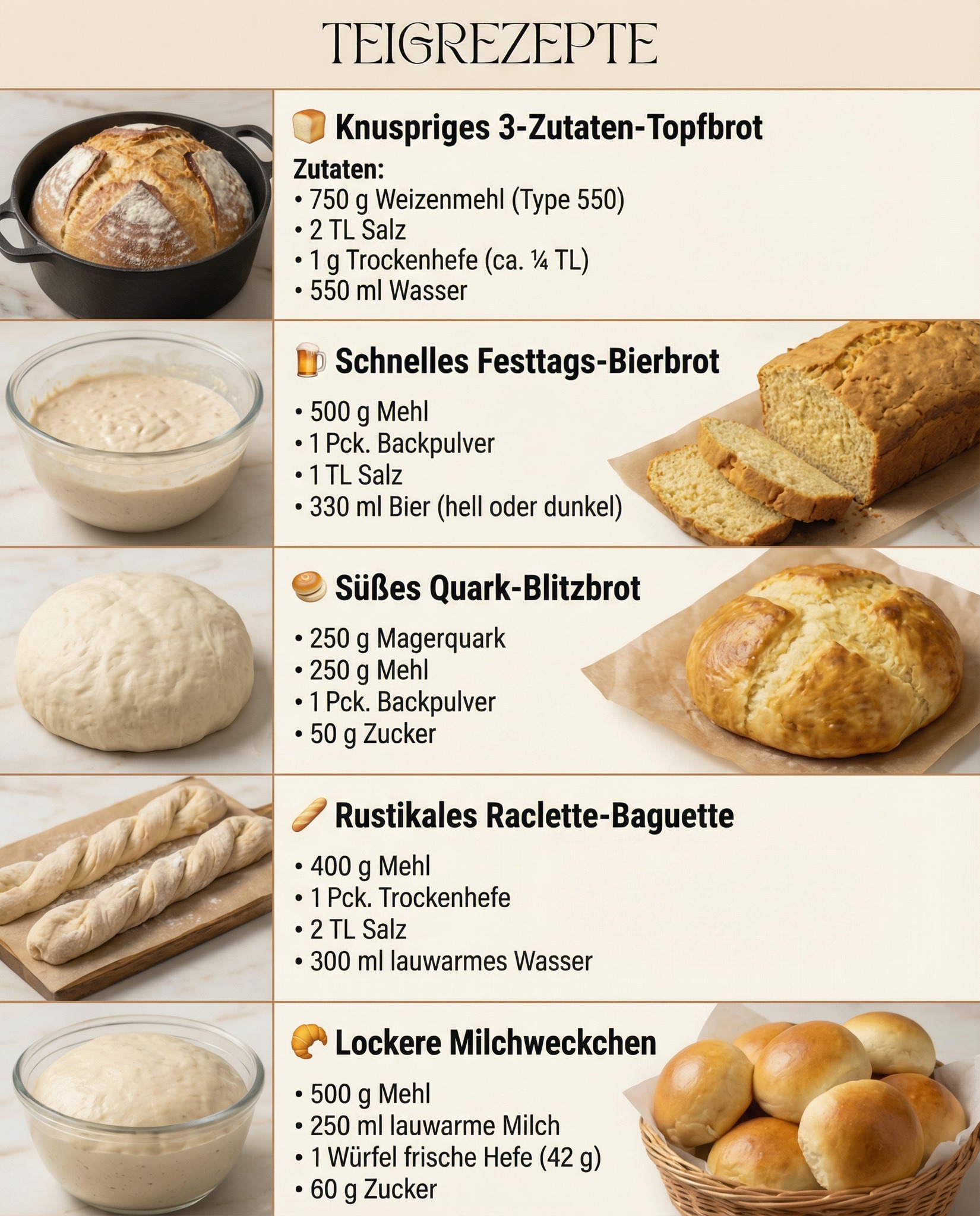 Selbst gebackenes Brot liegt voll im Trend – und das aus gutem Grund. Der Duft von frischem Brot aus dem Ofen, die knusprige Kruste und die weiche Krume machen das Backen zu Hause zu einem echten Genussmoment. Viele glauben jedoch, Brotbacken sei kompliziert oder zeitaufwendig. Dabei gibt es zahlreiche Rezepte, die mit wenigen Zutaten und einfachen Schritten gelingen. In diesem Beitrag findest du fünf beliebte Brotrezepte für unterschiedliche Geschmäcker: vom rustikalen Topfbrot über ein schnelles Bierbrot bis hin zu süßen Milchweckchen. Ob ohne Kneten, ohne lange Gehzeit oder mit besonders fluffigem Ergebnis – hier ist für jeden Anlass das passende Brot dabei. Diese Rezepte eignen sich perfekt für Anfänger, spontane Backideen oder wenn du einfach frisches, hausgemachtes Brot genießen möchtest.