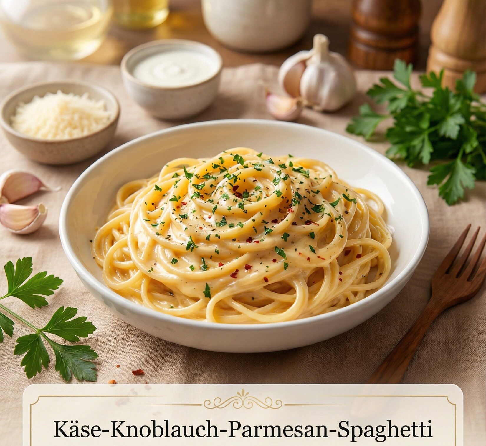 Die Käse-Knoblauch-Parmesan-Spaghetti sind ein cremiges, aromatisches und schnelles Nudelgericht, das garantiert begeistert. Mit wenigen Zutaten entsteht eine luxuriöse Soße, die jedes Pasta-Herz höher schlagen lässt.