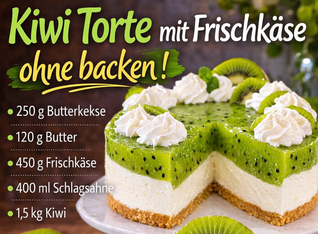 Die Kiwi Torte mit Frischkäse ohne Backen ist ein herrlich frisches und cremiges Dessert, das besonders an warmen Tagen begeistert. Mit einem knusprigen Keksboden, einer luftigen Frischkäsecreme und einer fruchtigen Kiwi-Schicht vereint diese Torte verschiedene Texturen und Geschmacksrichtungen in einem perfekten Gleichgewicht. Da diese Torte ohne Backofen zubereitet wird, ist sie besonders einfach und schnell vorbereitet. Nach einer kurzen Kühlzeit im Kühlschrank entsteht ein erfrischender Kuchen, der sich ideal für Familienfeiern, Geburtstage oder sommerliche Nachmittage eignet. No-Bake-Desserts erfreuen sich großer Beliebtheit, weil sie unkompliziert zuzubereiten sind und meist mit wenigen Zutaten auskommen. Besonders Frischkäse sorgt für eine cremige Konsistenz, während Gelatine dafür sorgt, dass die Torte stabil bleibt. Die Kombination aus süßer Frischkäsecreme und der leicht säuerlichen Kiwi ergibt ein besonders frisches Geschmackserlebnis. Die leuchtend grüne Fruchtschicht macht die Torte außerdem optisch zu einem echten Highlight auf jeder Kaffeetafel.