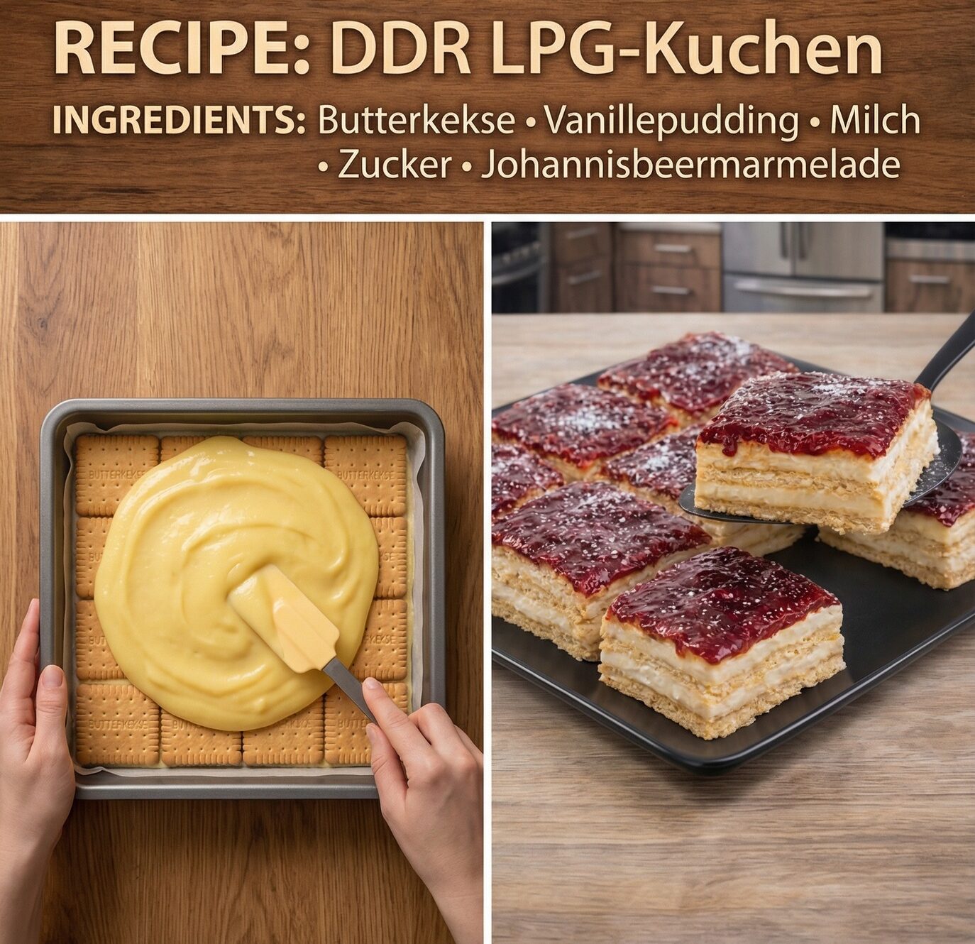 Der LPG-Kuchen gehört zu den beliebten Klassikern der ehemaligen DDR-Küche. Dieses einfache Dessert überzeugt durch seine unkomplizierte Zubereitung und seinen wunderbar cremigen Geschmack. Der Kuchen besteht aus wenigen Zutaten wie Butterkeksen, Vanillepudding und fruchtiger Marmelade, die zusammen zu einem zarten Schichtkuchen kombiniert werden. Da er ohne Backen zubereitet wird, eignet er sich perfekt für alle, die schnell einen leckeren Kuchen vorbereiten möchten. Besonders praktisch ist, dass dieser DDR-Schichtkuchen nur wenige Minuten Vorbereitung benötigt. Nach dem Schichten der Zutaten muss der Kuchen lediglich im Kühlschrank fest werden. Während dieser Zeit verbinden sich die Kekse mit dem Vanillepudding zu einer weichen, fast kuchenähnlichen Konsistenz. Die Johannisbeermarmelade sorgt dabei für eine angenehme fruchtige Note und eine leichte Säure, die wunderbar mit der süßen Creme harmoniert. Solche einfachen Kühlschrankkuchen waren in vielen Haushalten der DDR sehr beliebt, da sie mit wenigen Zutaten auskamen und trotzdem ein köstliches Ergebnis lieferten. Auch heute erfreuen sich diese Rezepte großer Beliebtheit, weil sie schnell gelingen und sich gut vorbereiten lassen, etwa für Familienfeiern, Geburtstage oder ein gemütliches Kaffeetrinken. In diesem Artikel erfährst du, wie du den klassischen LPG-Kuchen Schritt für Schritt zubereitest und mit wenigen Zutaten einen cremigen No-Bake-Schichtkuchen zauberst.