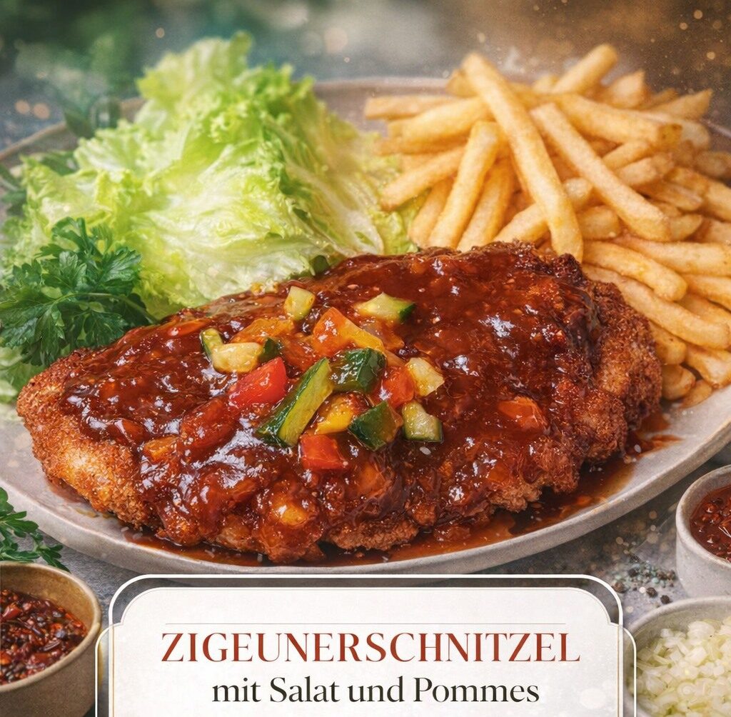 Das Paprikaschnitzel mit Pommes ist ein beliebtes Gericht der herzhaften Küche und überzeugt durch seine Kombination aus knusprig gebratenem Schnitzel, würziger Paprikasauce und goldbraunen Pommes frites. Die aromatische Sauce aus Paprika, Zwiebeln und Tomatenmark sorgt für eine kräftige Note, während die cremige Verfeinerung mit Sahne das Gericht harmonisch abrundet. Besonders geschätzt wird dieses Rezept wegen seiner ausgewogenen Mischung aus knuspriger Textur und sämiger Sauce. Die panierten Schnitzel bilden die Grundlage, während die Paprikasauce für Saftigkeit und Geschmack sorgt. In Kombination mit knusprigen Pommes entsteht ein sättigendes Gericht, das sowohl bei Familien als auch bei Gästen gut ankommt. Ob als klassisches Sonntagsessen oder als besonderes Abendgericht – dieses Schnitzelrezept ist vielseitig und lässt sich gut an persönliche Vorlieben anpassen. Mit einem frischen Salat serviert entsteht eine runde Mahlzeit mit ausgewogenem Geschmack.
