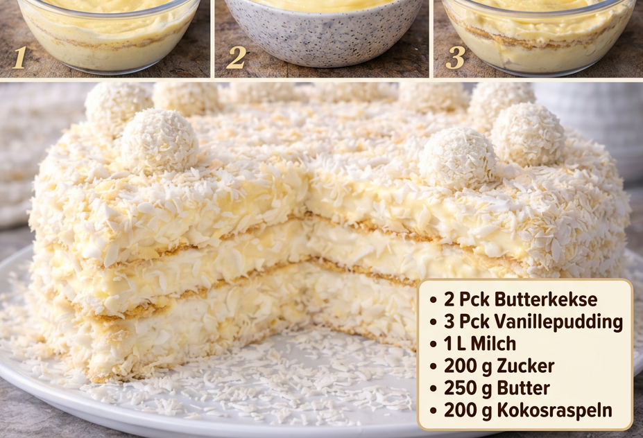 Das Beste an diesem Rezept ist, dass kein Backofen benötigt wird. Die Kombination aus Butterkeksen, Vanillecreme und Kokosraspeln sorgt für eine perfekte Balance zwischen weich und leicht knusprig.